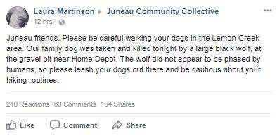 Laura Martinson posted to the Facebook page Juneau Community Collective around 11 p.m. Wednesday that her father encountered a wolf while walking their dog near the gravel pit behind Home Depot in Lemon Creek. When reached for comment via Facebook messenger, she confirmed the account to the Empire.