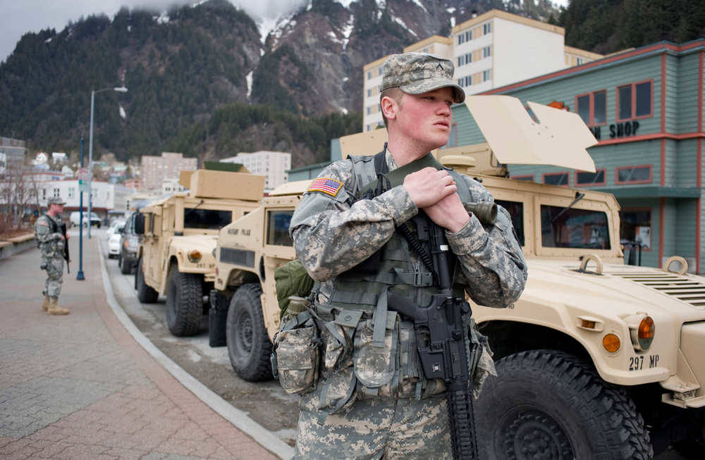 In this April 2011 photo, Private Gabriel Jones of Wasilla, right, and Private Joshua Bollick of Anchorage, stand guard next to three armoured personel carriers belonging to the Alaska Army National Guard 297th Military Police Company as they practice in downtown Juneau. (Juneau Empire File)