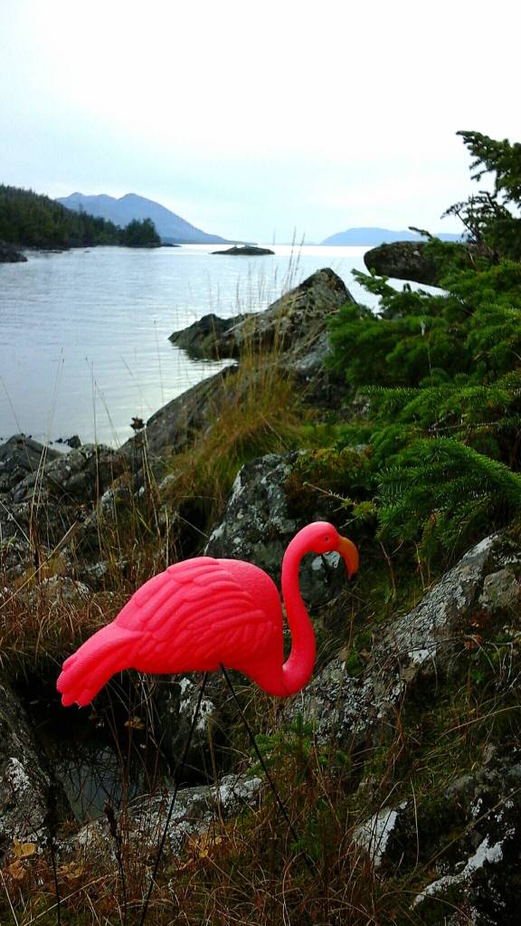My sister, Megan A. Duncanson, a very successful artist who uses her initials for her art-empire-in-the-making, had bought a small island in Meyers Chuck last month and she wanted me to stake claim to it for her. She lives in Miami and decided pink flamingos were going to be her representatives. She had a flock of them migrate up here for the winter via Amazon. They’re waiting for her arrival in early summer, when she plans to build a cabin and Alaskan studio on her island.