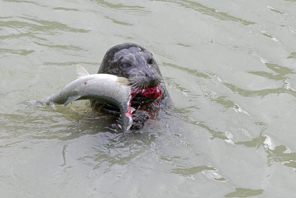 Seals sometimes congregate at the mouths of rivers when the salmon are coming in to start the spawning runs (giving commercial fishermen heartburn). For several decades in the early 1900s, there was a bounty on them, for their presumed (not measured) competition with human fishers. In several rivers, seals even follow the salmon upstream for a distance; they sometimes appear in Mendenhall Lake. Up north, Lake Illiamna is home to a nearly unique fresh-water population of harbor seals (a few other freshwater populations exist in northeastern Canada). The Illiamna population, along with the salmon runs and other inhabitants of the area, is at risk from the proposed Pebble mine project.