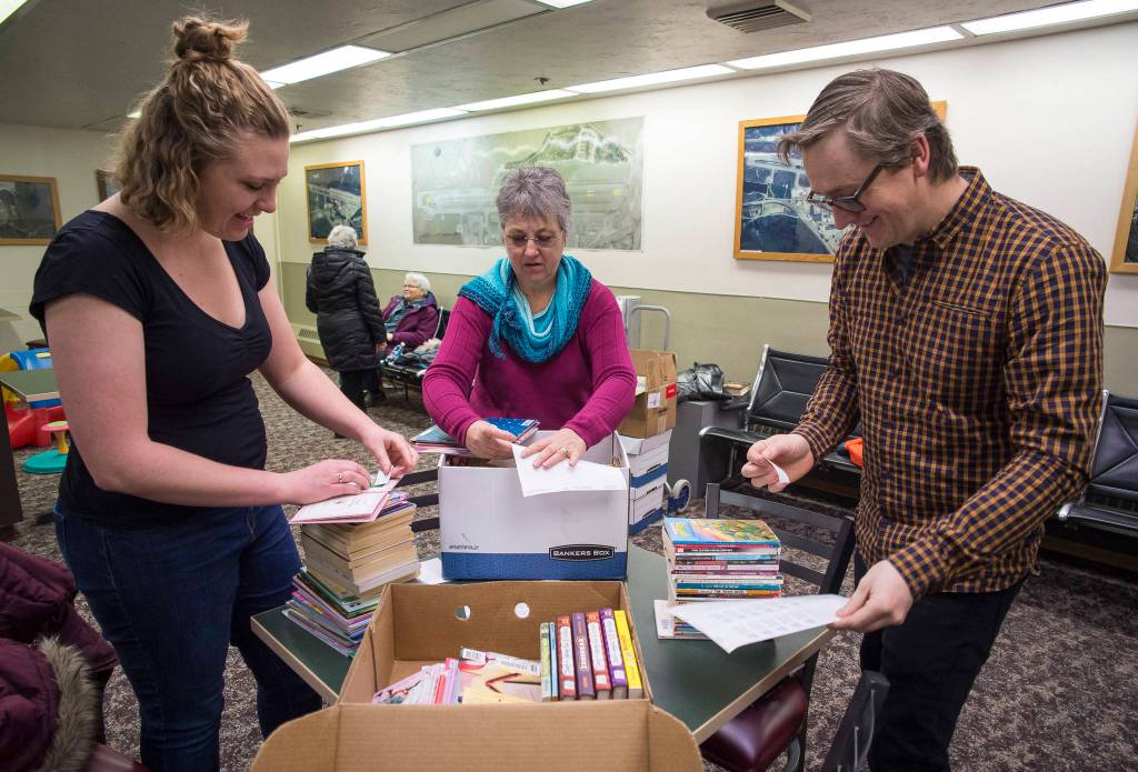 On Wednesday, Nov. 15, a group made up of representatives from the Association for the Education of Young Children, Southeast Alaska (AEYC), Friends of the Juneau Public Libraries, United Way of Southeast Alaska, Alaska Litho, and Rainforest Custom gathered at Juneau International Airport’s charter plane wing to shelve boxes of books for one of their new Read On the Fly shelves.