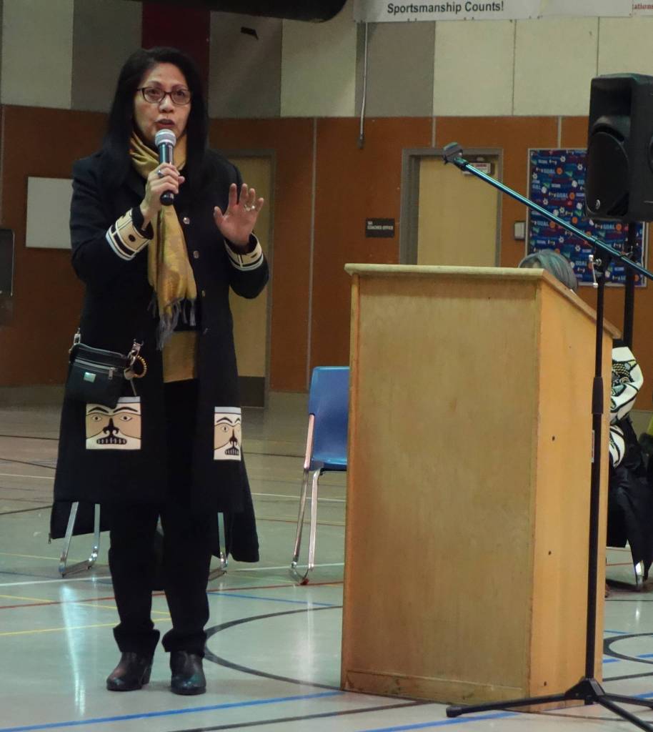As Principal Jim Thompson accepted the gift of the panels from SHI, he told all gathered that he hadn’t been sure what he was going to say when he spoke, but he listened to what the elders and members of SHI said during the ceremony. Their words, he said, reminded him of a memory. His wife came from a different culture, he said, and at his wedding when someone gave a traditional Irish toast, he said “Your family is now a blanket. May your fabric be strong and your colors bright.”