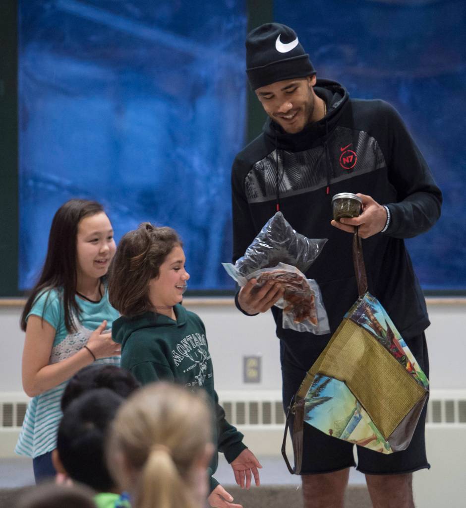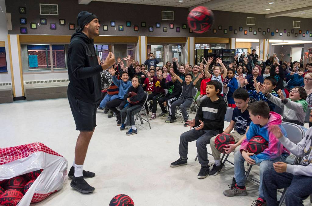 Dzantik’i Heeni Middle School sixth-graders went home on Friday with more than fresh homework. Thanks to an assist from Central Council of Tlingit and Haida Indian Tribes of Alaska, the roughly 160 youth also had with them a snazzy basketball and experience meeting a professional basketball player.