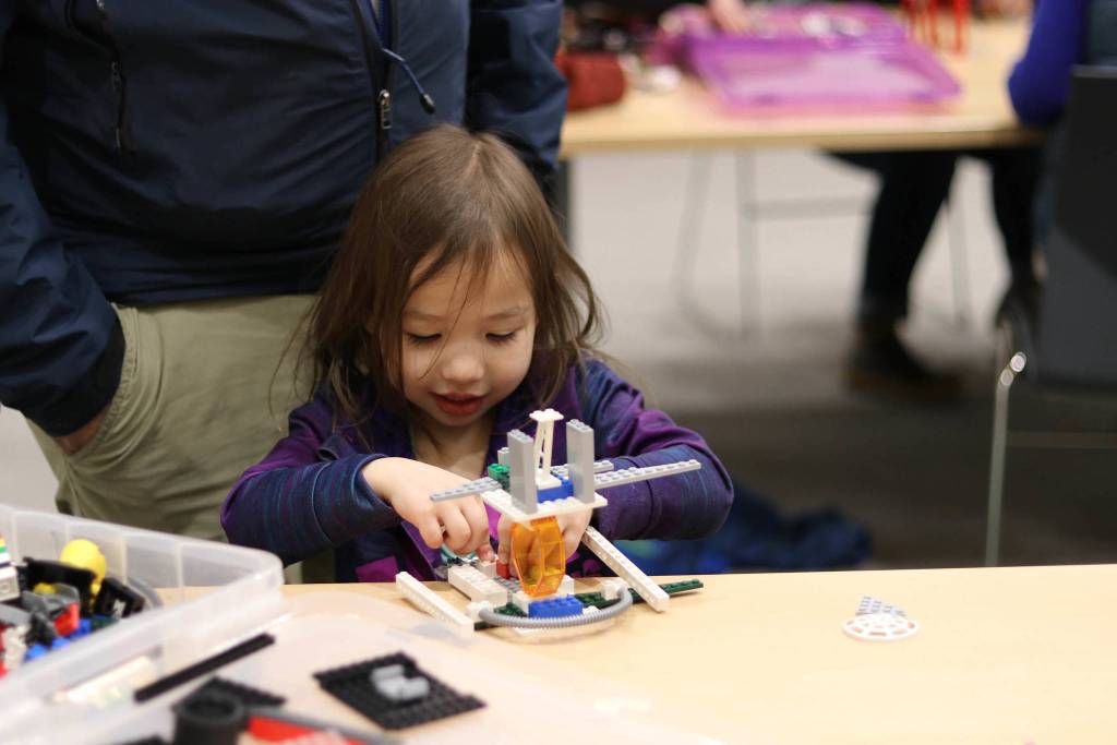 The large exhibit includes 15 different sections located throughout the Mendenhall Valley Public Library. Several hands-on and interactive sections — featuring solar power, a circuit building challenge and engineering — allow kids to collaborate and be creative. The exhibit will be accompanied by a series of programs and events to bring STEM programming to children, teens and adults. It all began with an opening reception and LEGO building challenge on Saturday, Jan. 13.