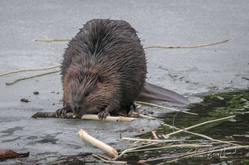A beaver came out of its winter rest in the lodge to have lunch on the ice. (Photo by Kerry Howard)