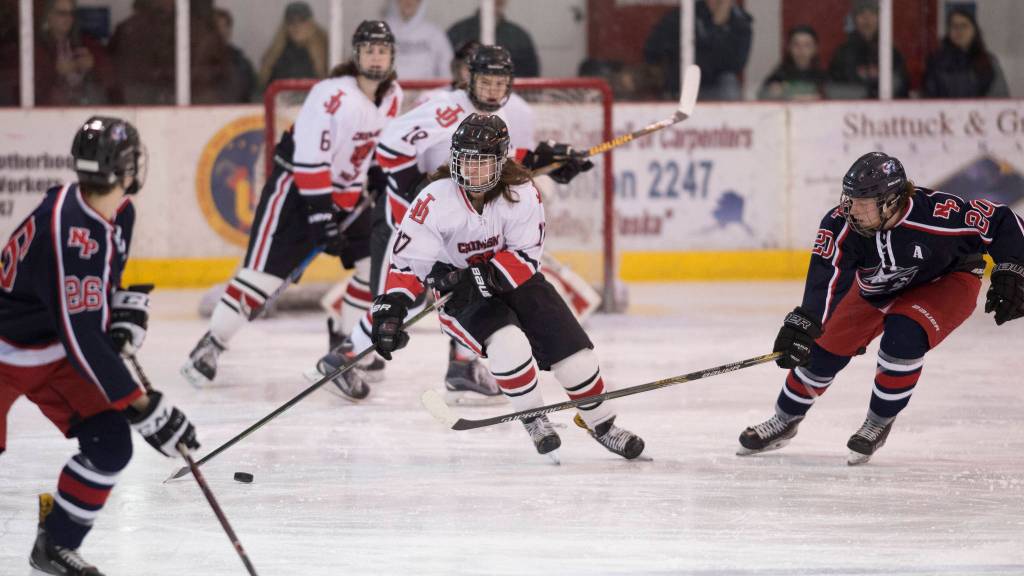 Flanked by Patriots defenders on either side of him, Ginter one-timed a puck from Cameron Smith midway through the period to score the final Crimson Bears’ goal in a 4-2 win at Treadwell Arena.
