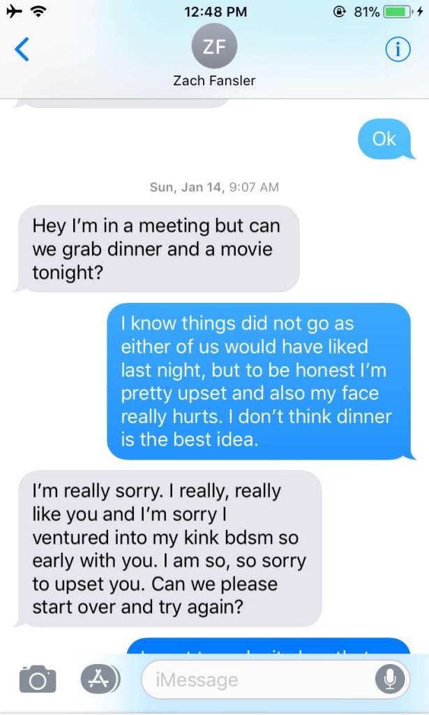 After the woman, in a lengthy text message to Fansler, said she wanted nothing to do with him and explained her injuries, he apologized profusely by text and said he was sorry that he brought his “bdsm kink” out.