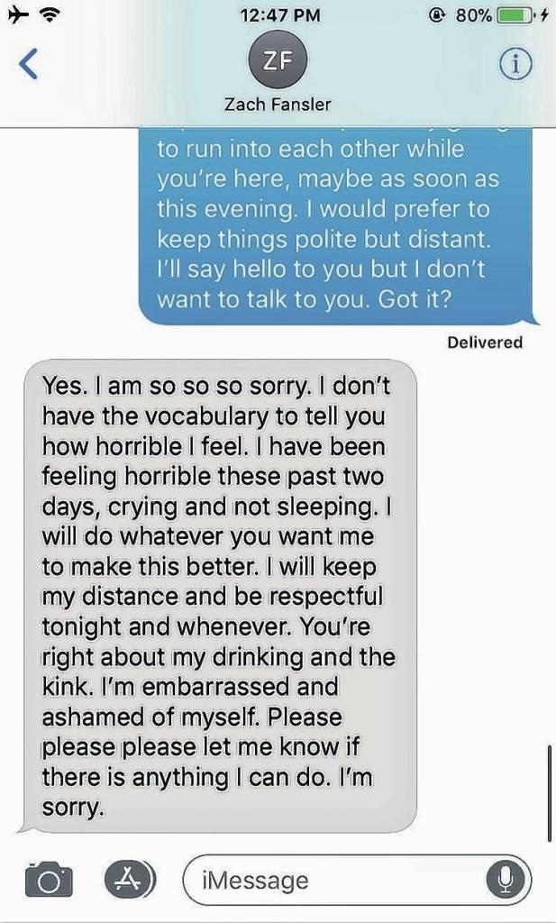 In text messages to her later that day, Fansler asked if he could take her to a dinner and a movie to make it up to her. She declined.
