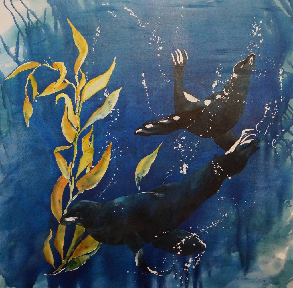 Painter Patti Hutchens Jouppi has decided to brighten up these dark winter days with her First Friday exhibit “Unfathomable.” In this series of paintings featuring sea life, she mimics what it is like to be underwater by attaching LED strip lights behind the canvas and turning other lights off inside the Juneau Arts & Culture Gallery.