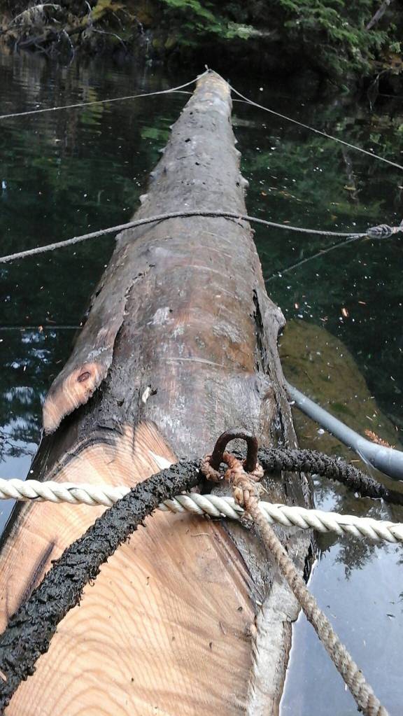 We had to wait a full day before we could work on it again because by then the tide was going out in the early morning hours. The next time, as the tide was coming in, I found that I didn’t need the cumalong (hand winch) to make it move, just the pike pole. I took the cumalong off and the log glided easily under the brow log as I levered my weight against the pole, standing on the log.
