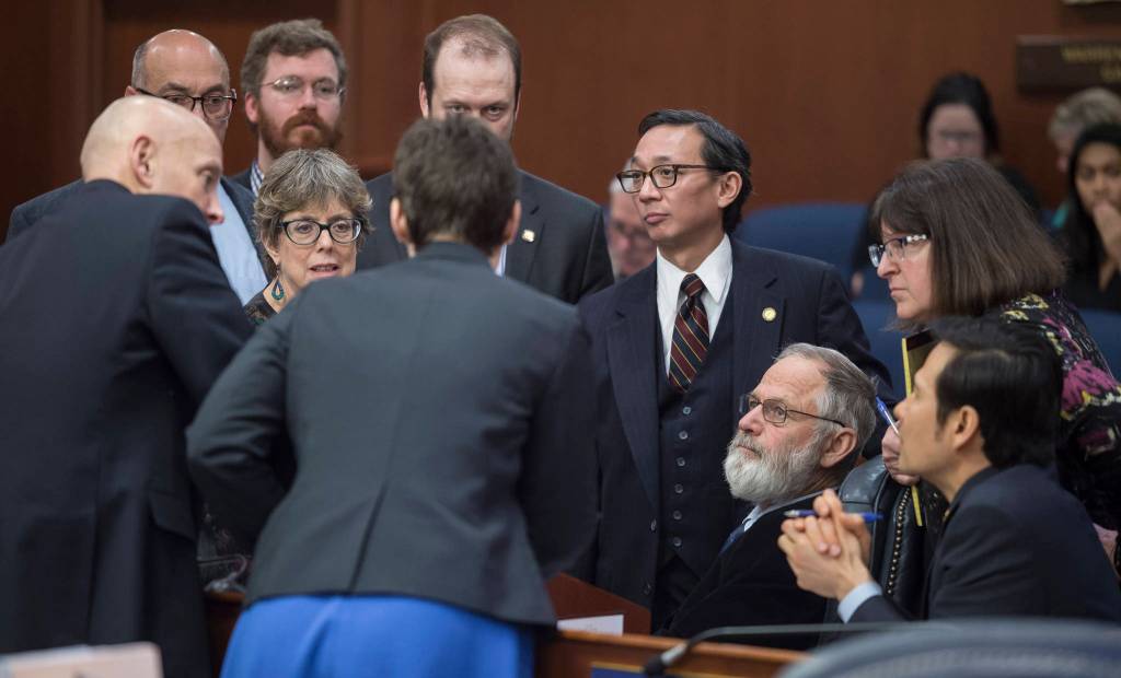 Michael Penn | Juneau Empire  Members of the House Majority Caucus speak to each other during a break in debate on the House education bill at the Capitol on Wednesday.