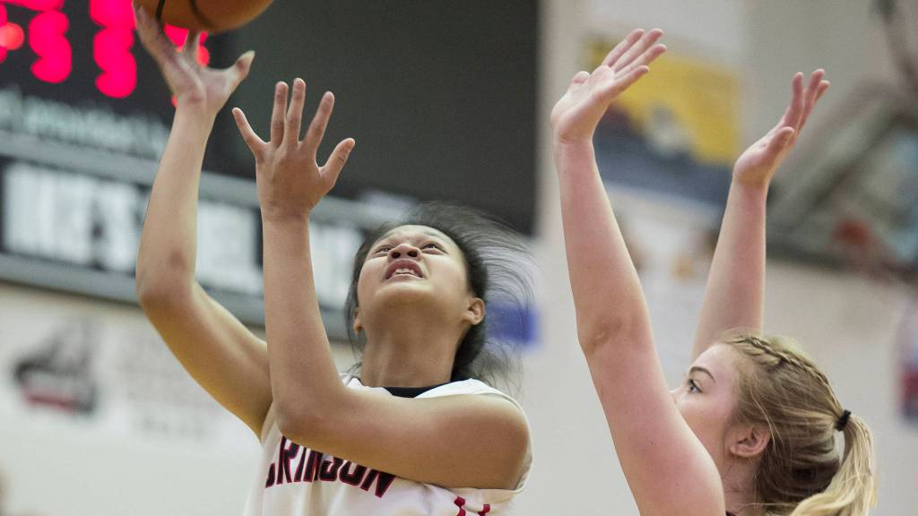 Juneau-Douglas’ Alyxn Bohulano, left, shoots against Ketchikan’s Ashley Huffine at JDHS on Friday, Feb. 16, 2018. (Michael Penn | Juneau Empire)