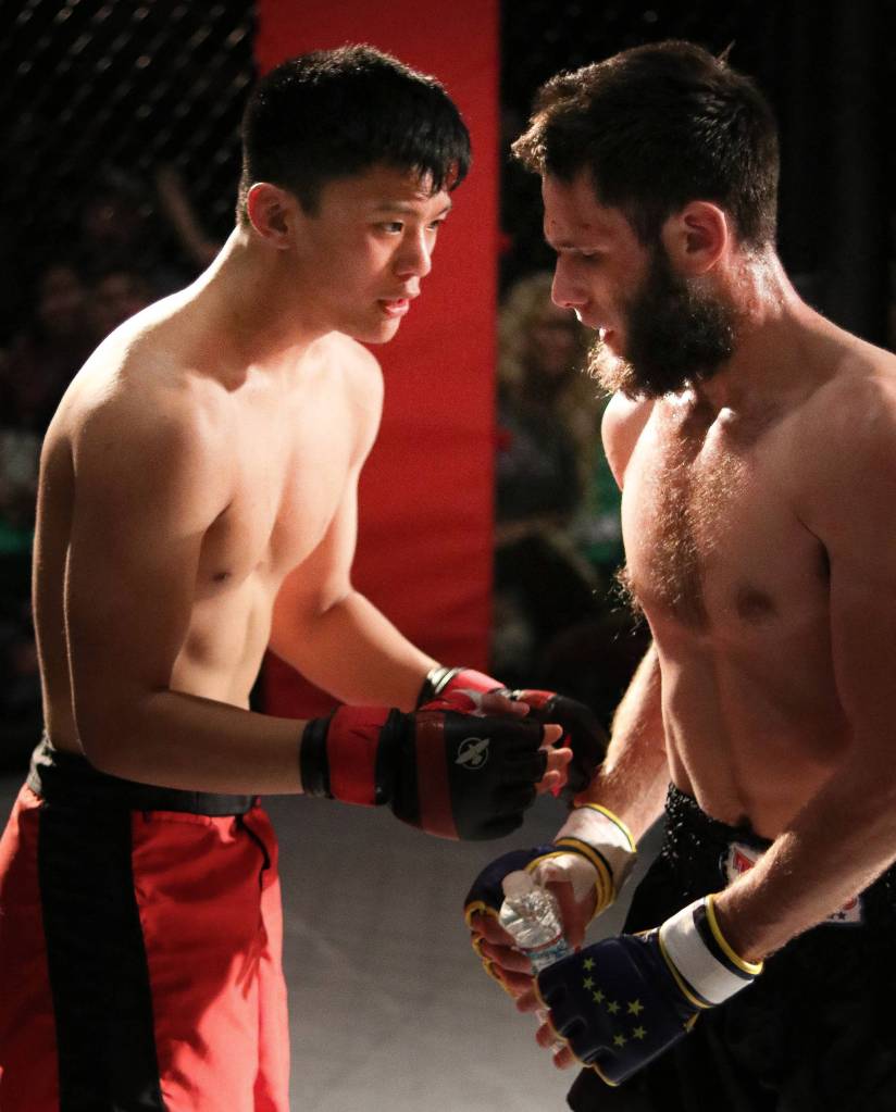 Kyle “Filipino Flower” De La Rosa, left, acknowledges his opponent Cody “The Wolverine” Williams after their main event at the 31st Alaska Beatdown at Elizabeth Peratrovich Hall on Saturday, March 17, 2018. (Erin Laughlin | For the Juneau Empire)