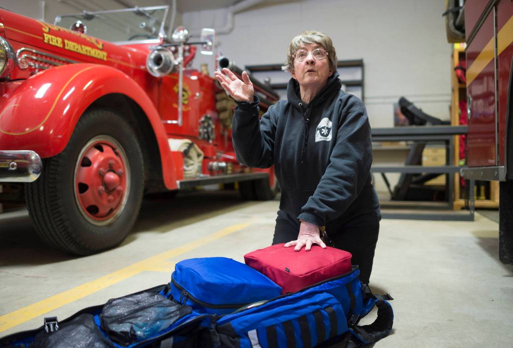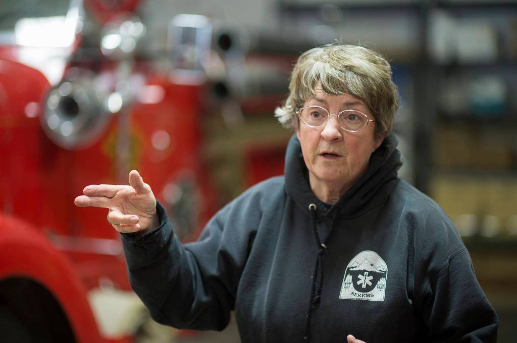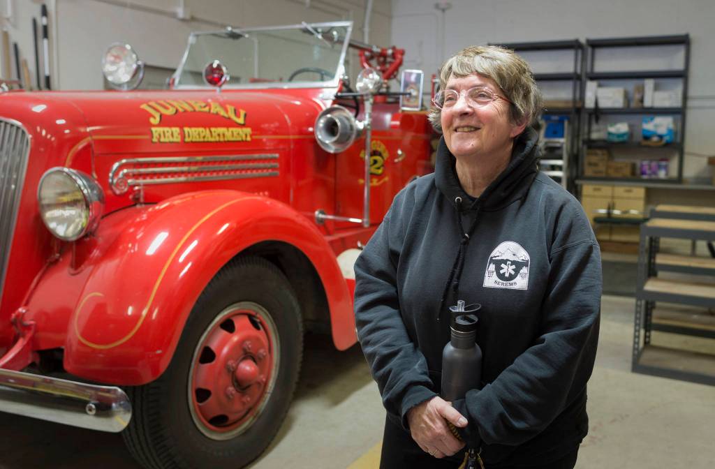 Kathy Miller talks on Tuesday, March 6, 2018, about her 10 years as a volunteer firefighter/EMT for Capital City Fire/Rescue at the Lynn Canal Fire Station after a career as a nurse. (Michael Penn | Juneau Empire)