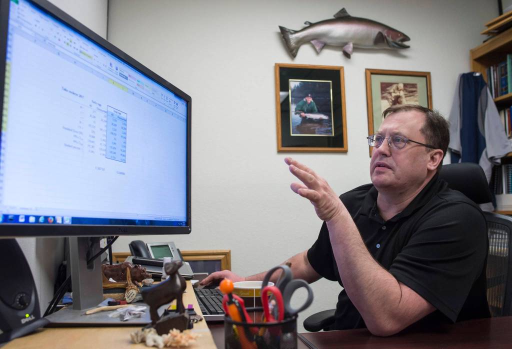 Ed Jones, Fish and Game Coodinator for the Division of Sport Fish at the Department of Fish and Game, speaks Thursday, March 22, 2018, about the collected data on sockeye and king salmon from the Taku River. (Michael Penn | Juneau Empire)