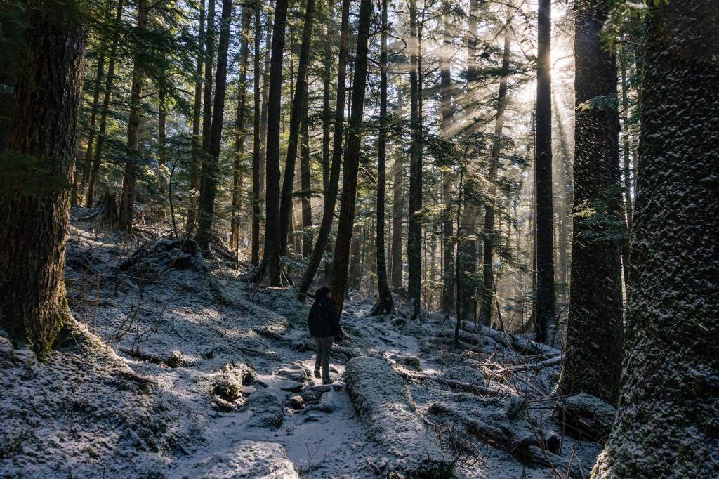 All that remains of the facility is a portion of the wooden dock and several cement foundation structures. Many fishermen and families hike the trail in the summer, but our group was alone on the path Wednesday. We had an extra Juneau moment when we ran into my friend Claire who was just out enjoying the sunshine — she joined us for most of the hike.