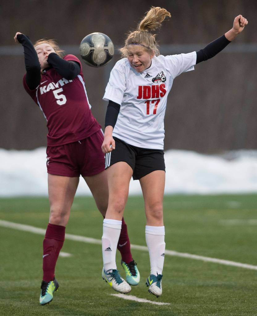 The JDHS girls host their next home games next Thursday and Saturday against West Anchorage. The team is still waiting to play on its home field at Adair Kennedy Memorial Park. The team has been practicing on the smaller-sized turf field outside JDHS in recent weeks.