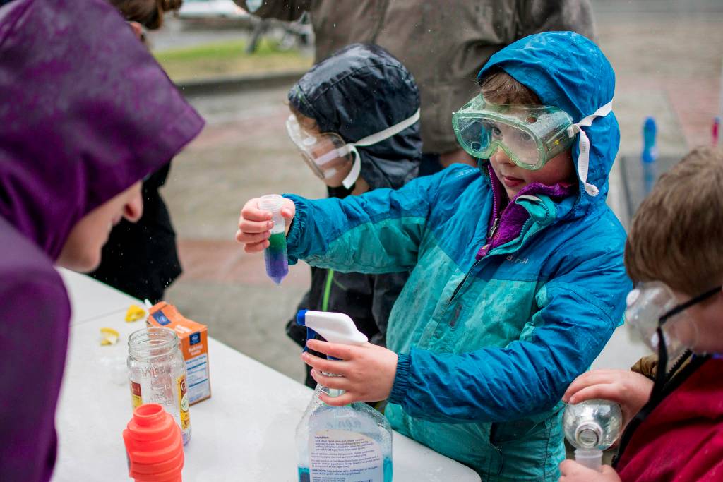 Maia Hood learns about chemical reactions during the March for Science at the Alaska Capitol on Saturday, April 14, 2018. (Richard McGrail | Juneau Empire)