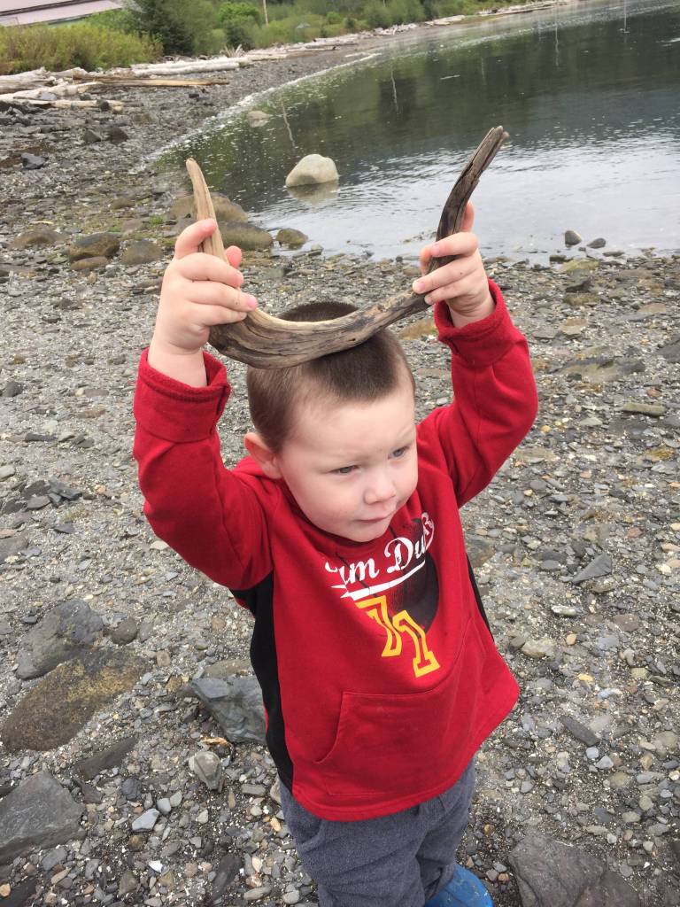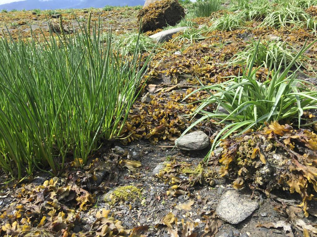 I crouch down on the beach beside Grandson Jonah. A field of green clumps of grass-like plants we call goose tongue surrounds us. In Tlingit it’s called sukhtéitl’. I explain to my toddler-aged grandson how we first have to thank the plant for giving its life: “We have to say Gunalchéesh, Gunalchéesh.” Then I say, “We call this plant sukhtéitl’.” I pinch the end of the word, making a sharp sound and Grandson Jonah mimics me.
