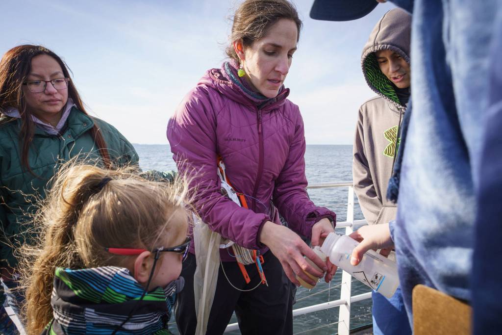 Chohla Moll helps students with plankton sampling near Middle Island, an important place for harvesting herring eggs. Maia Mares | For the Capital City Weekly Chohla Moll helps students with plankton sampling near Middle Island, an important place for harvesting herring eggs. Maia Mares | For the Capital City Weekly
