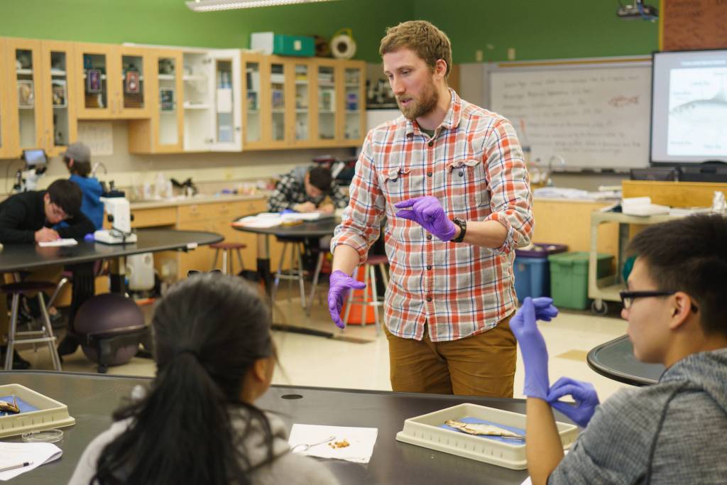 Kyle Rosendale, fisheries biologist for the Sitka Tribe of Alaska, teaches students about herring anatomy through dissection. Bethany Goodrich | For the Capital City Weekly Kyle Rosendale, fisheries biologist for the Sitka Tribe of Alaska, teaches students about herring anatomy through dissection. Bethany Goodrich | For the Capital City Weekly