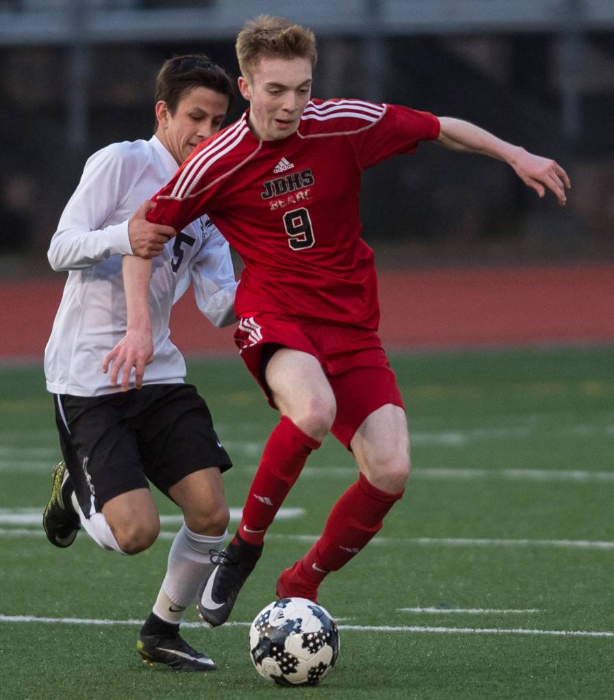 Juneau-Douglas’ Jackson Norberg punches the ball between West Anchorage’s Dominic Owen, left, and Jack Nelson, right, at Adair-Kennedy Memorial Park on Friday, April 20, 2018. West won 3-1. (Michael Penn | Juneau Empire)