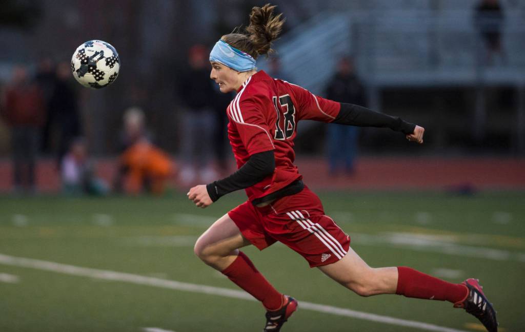 Juneau-Douglas’ Clem Taylor-Roth stretches to head a cross against West Anchorage at Adair-Kennedy Memorial Park on Friday, April 20, 2018. West won 3-1. (Michael Penn | Juneau Empire)