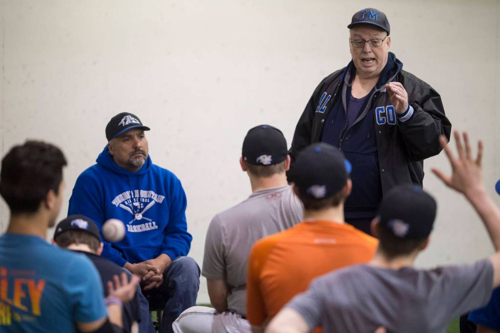 Coaches Mill McCauley, right, and Joe Tompkins speaks to varsity and junior varsity players during Thunder Mountain High School baseball practice at the Wells Fargo Dimond Park Fieldhouse on Tuesday, April 24, 2018. (Michael Penn | Juneau Empire)