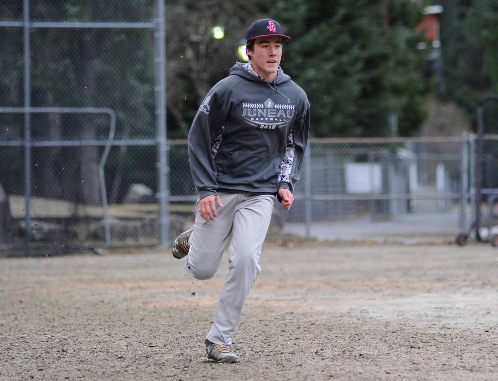 Freshman Olin Rawson performs a base-running drill during Juneau-Douglas High School baseball practice on Wednesday, April 25, 2018. (Nolin Ainsworth | Juneau Empire)