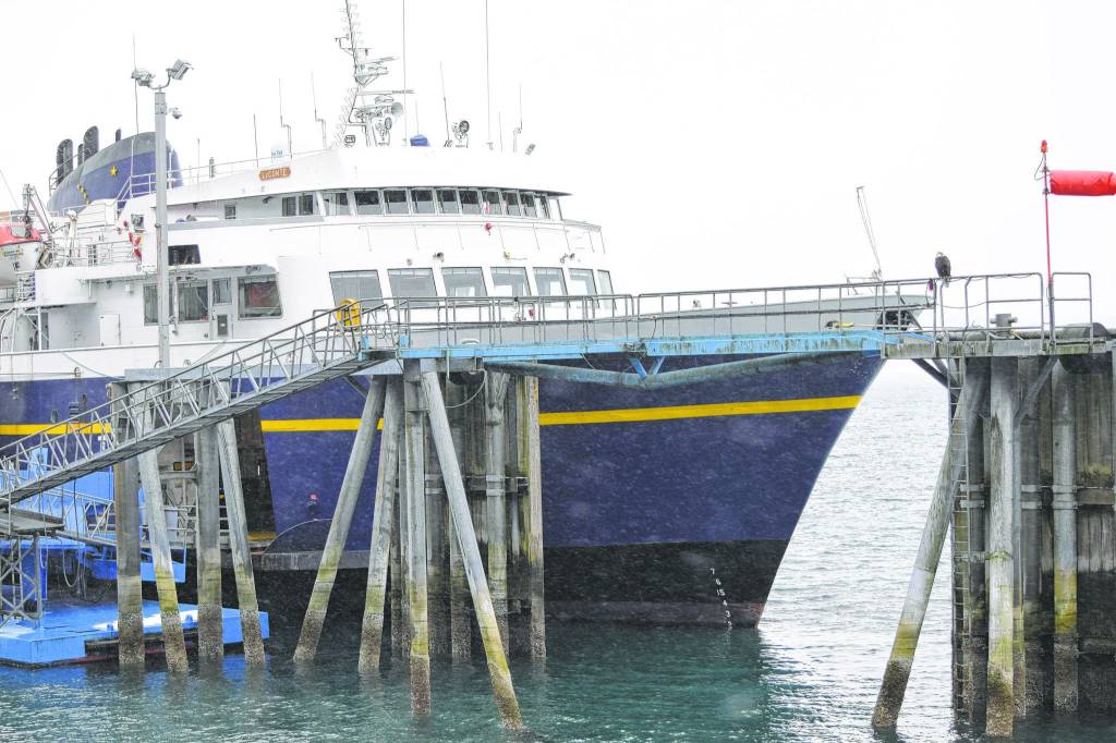 The M/V LeConte awaits repairs at the Alaska Marine Highway System terminal in Juneau in March 2018. (Kevin Gullufsen | Juneau Empire File)