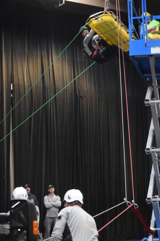 The rope rescue event wasn’t exactly what the Pogo team would encounter in a real-life mine rescue, but it’s close. A Ford F-250 and the rafters of ballroom served as anchor points for the team’s pulley system. The ballroom floor took the place of the earthen ground inside a mine. The convention centers clear lighting illuminated what might normally only be lighted by headlamp.