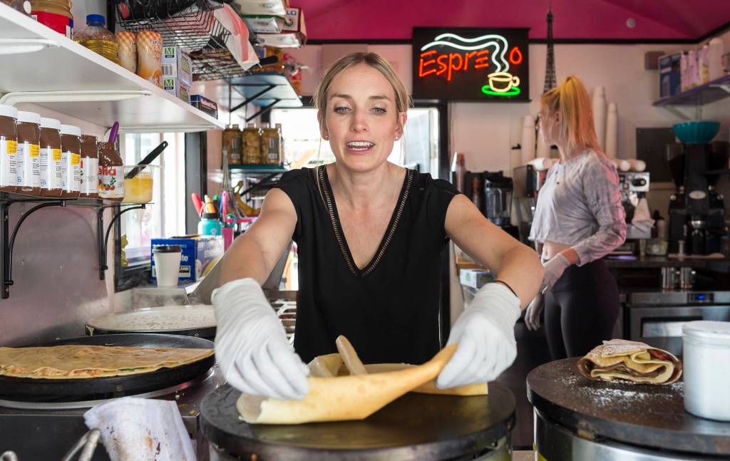 Crepe Escape owner Amanda Kohan talks about her recent break-in while making crepes during the lunchtime rush on Tuesday, May 15, 2018. (Michael Penn | Juneau Empire)