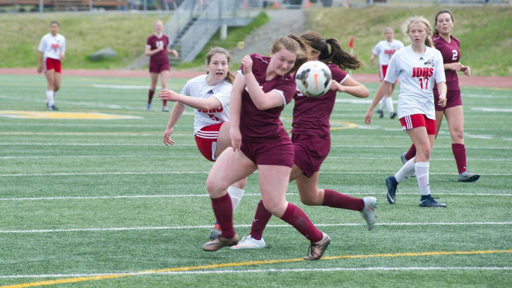 Juneau-Douglas High School’s Eva Goering shoots through two Grace Christian defenders in the ASAA Division II state championship game at Service High School on. The ball hit off the crossbar but JDHS won the game 3-0. (Nolin Ainsworth | Juneau Empire)