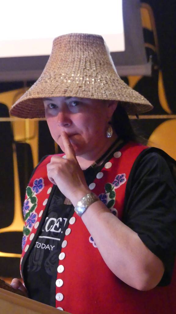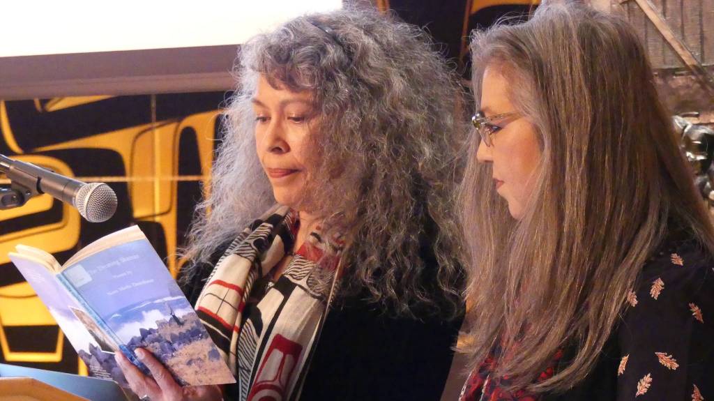 Rhonda Mann, who performed a few of Nora’s pieces on Friday, said right out of college she began working with the Dauenhauers on the publication of their books, held and transcribed interviews with elders, and helped create the Tlingit typeset so that the oral language, complex in tones and guttural sounds, could persist in text form.