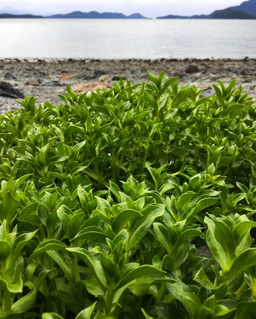 Beach greens, a wild green that can be found on beaches all over Alaska — including on the upper edges of Juneau’s rocky beaches — are a beautiful mounding plant with thick green leaves. Use scissors to cut off the top four inches before the plant flowers and you’ll get a tasty green which is delicious lightly steamed, blanched or sauteed. It has a pleasantly bitter taste and texture similar to a mix between cabbage and snap peas. I keep my beach greens in my fridge submerged in a bowl of water for weeks.