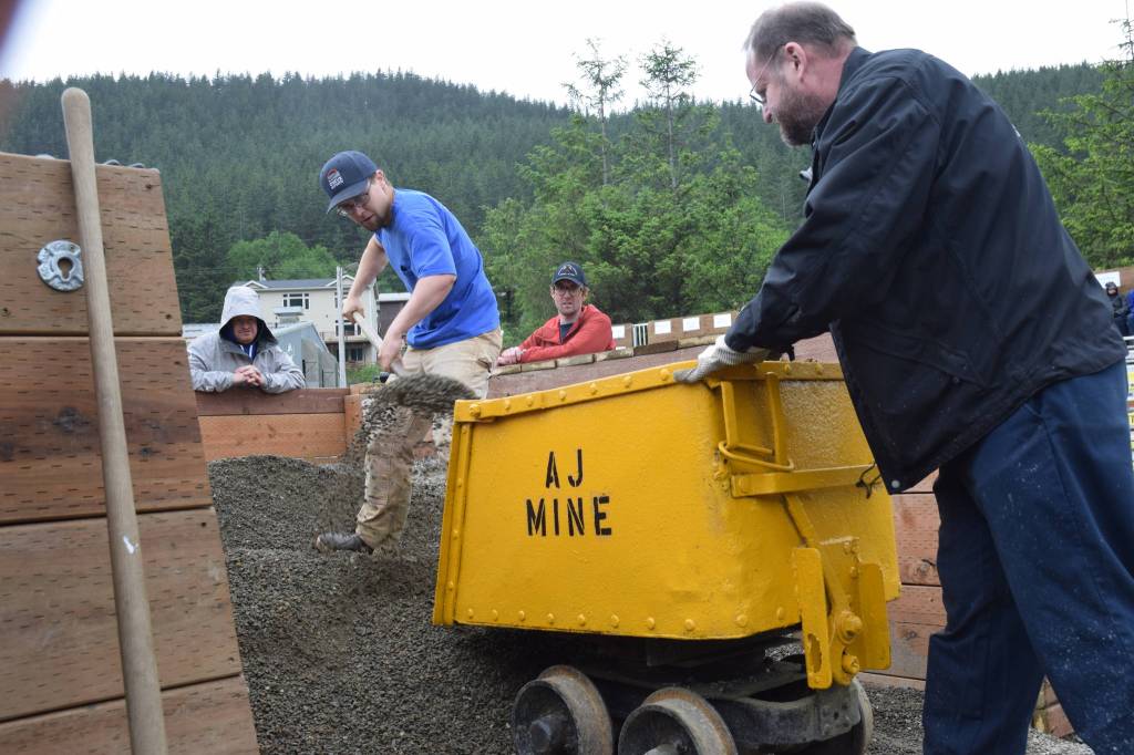 Kirstie Bakk, visiting Juneau for Gold Rush Days, works in public relations for Couer Alaska, Kensington Mine’s parent company. Bakk participated in the women’s hand mucking event Saturday. Competitors push a mine cart a few feet to a pile of gravel, then fill it up and push it back. Bakk has experience. Before taking her current position, she spent four summers hand mucking at a Couer operation in South Dakota.
