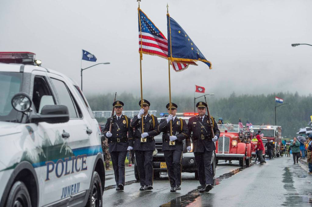 Juneau Police Department representatives march in the Juneau 4th of July parade on Tuesday, July 4, 2017. (Michael Penn | Juneau Empire File)