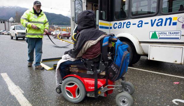 In this file photo from November 2014, a Care-A-Van driver picks up a person with a wheelchair at Centennial Hall parking lot. (Michael Penn | Juneau Empire File)