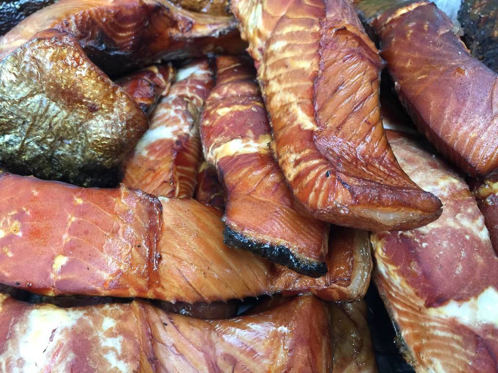 Hours later, the fish is done and my dad removes the racks from the smokehouse. My grandsons help me take the fish off and put them in pans. Inside the house, we each pick our favorite slice. I choose a slice of white king. My grandsons choose red king.