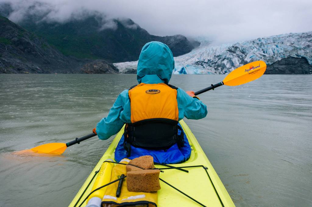 Katie led the way as we jumped in a tandem kayak at West Glacier trailhead on back loop and headed out. After some time paddling we pulled up the kayak on a little pebble beach to the left of the glacier. From there you follow an unmarked foot path to where the ice meets land. I haven’t worn boots since May on the Juneau Icefield traverse. I hate wearing boots. When are Marty McFly’s auto lacing tennis shoes with crampons going to be a reality?