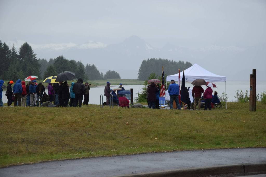 Through a steady rain, Alaska Pioneers Igloo 6 King Regeant Fred Thorsteinson read a commemoration.