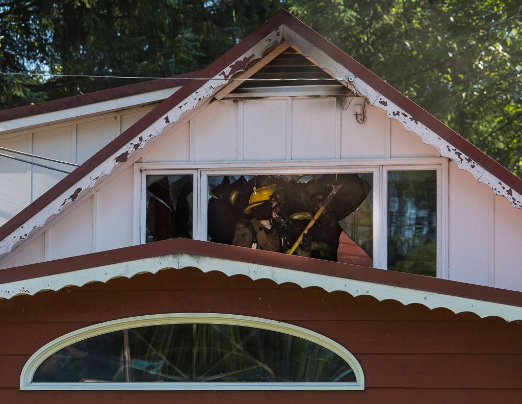 Capital City Fire/Rescue firemen open up a ceiling in an second-story room as they fight a house fire at 8460 Kimberly Street on Friday, July 20, 2018. (Michael Penn | Juneau Empire)