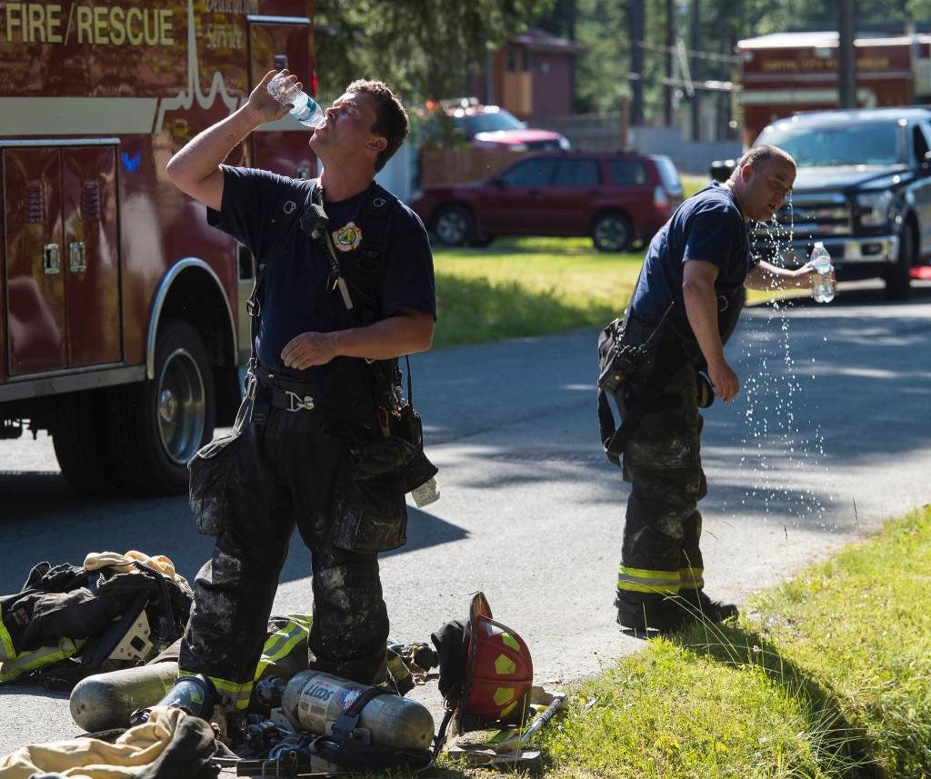 Capital City Fire/Rescue firemen attempt to cool off after fighting a house fire at 8460 Kimberly Street on Friday, July 20, 2018. (Michael Penn | Juneau Empire)