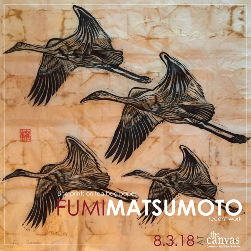 Fumi Matsumoto is showing her recent work of delicate lino print on tea bags paper at the Canvas Art Gallery through the month of August.