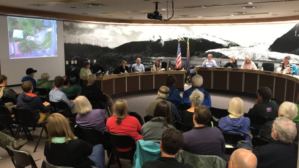 Starr Hill resident Vicki Van Vleet speaks at a Parks and Recreation Advisory Committee meeting on Tuesday, Aug. 7, 2018. More than 20 residents spoke at the meeting, imploring the committee to keep Chicken Yard Park. (Alex McCarthy | Juneau Empire)