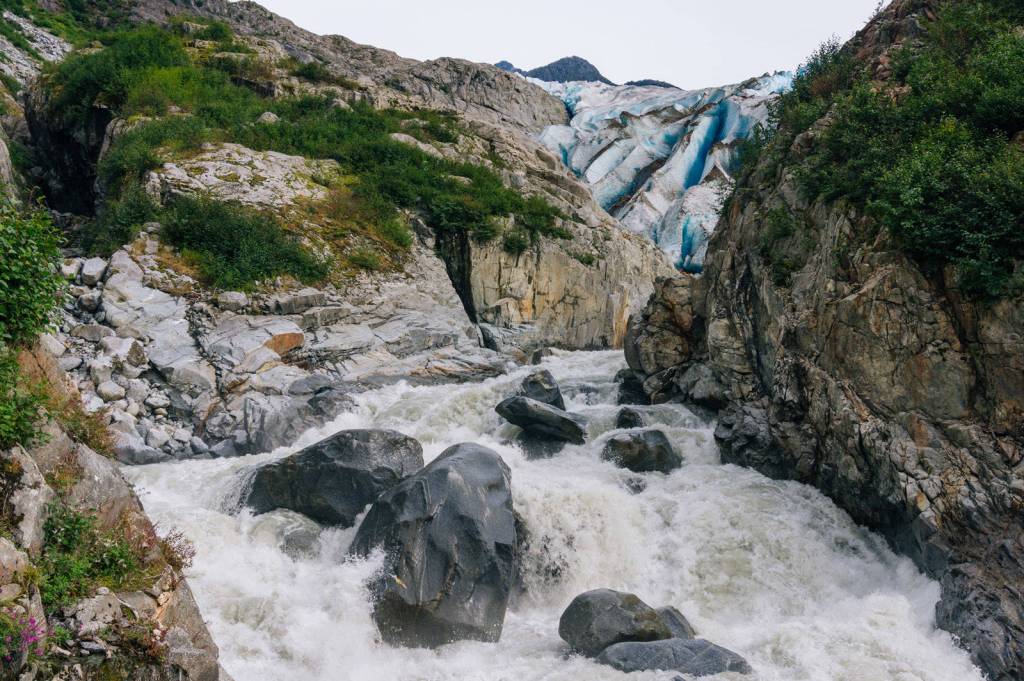 Over the weekend Katie McCaffrey and I spent almost eight hours approaching and exploring the Herbert Glacier at mile 28 on the Juneau road system. We carried glacier travel and crevasse rescue gear just in case we got to walk on the ice. We had every intention to get an early start when the sky was clear and bright, but because of a leisurely Gonzo’s breakfast we didn’t begin on the trail until around noon. At first, the trailhead was super warm but the shade from the old-growth canopy helped cool the way. As we continued towards the more recent glaciated terrain, the trees thinned and a cool breeze could be felt from the ice and raging river.