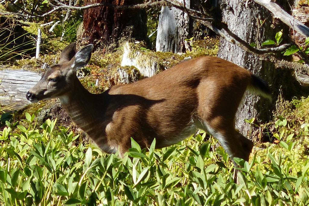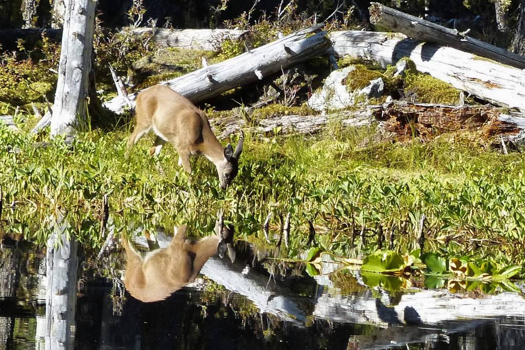 We took a walk, stopping at a forest pond. On the far side of the pond stood a sleek, beautiful doe, still decked out in her reddish summer coat. She foraged along the edge of the pond, occasionally stumbling in deep holes, nibbling a bit of buckbean, but concentrating apparently on some small willows and underwater greenery. She was watchful, frequently lifting her head with her big grey ears swiveling. Deer are less common than moose over by Glacier Bay, so this elegant lady was a treat.