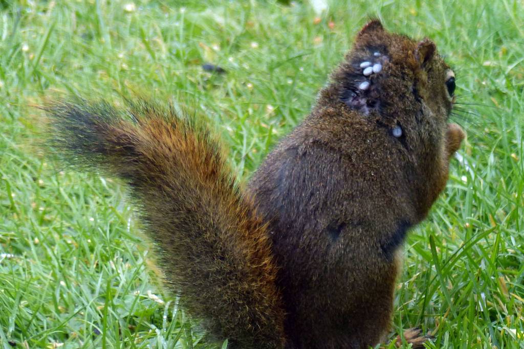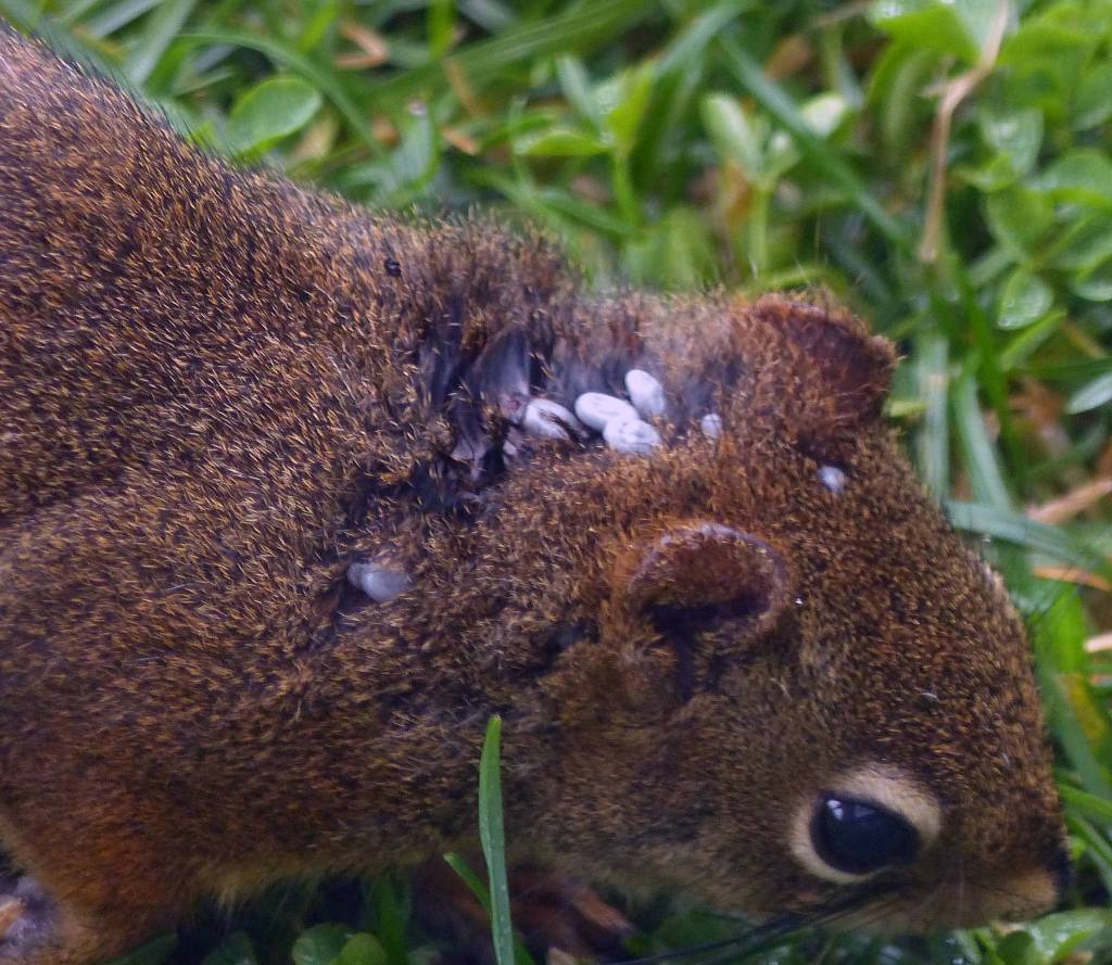 A red squirrel in Juneau has several ticks feasting on its blood. Note that the ticks are attached in places where it would be hard for the squirrel to remove them. (Courtsey Photo| Gus Van Vliet)