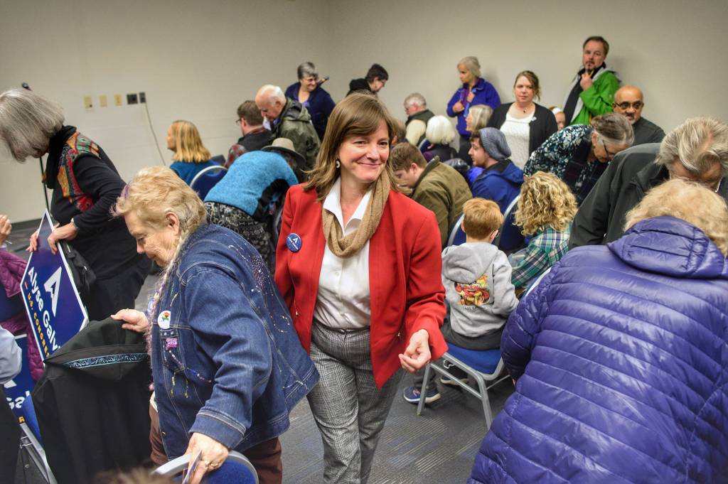 Alyse Galvin, Alaska’s independent candidate for U.S. House of Representatives, holds a town hall-style meeting to an overflowing room at Centennial Hall on Sunday, Oct. 21, 2018. (Michael Penn | Juneau Empire)
