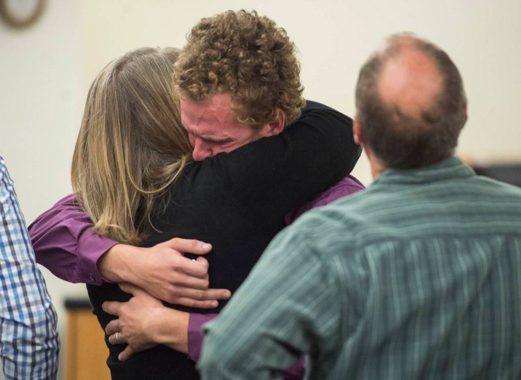 Ty Grussendorf, 24, center, hugs his parents after pleading guilty to two counts of sexual abuse of a minor in Juneau Superior Court on Monday, Oct. 22, 2018. (Michael Penn | Juneau Empire)